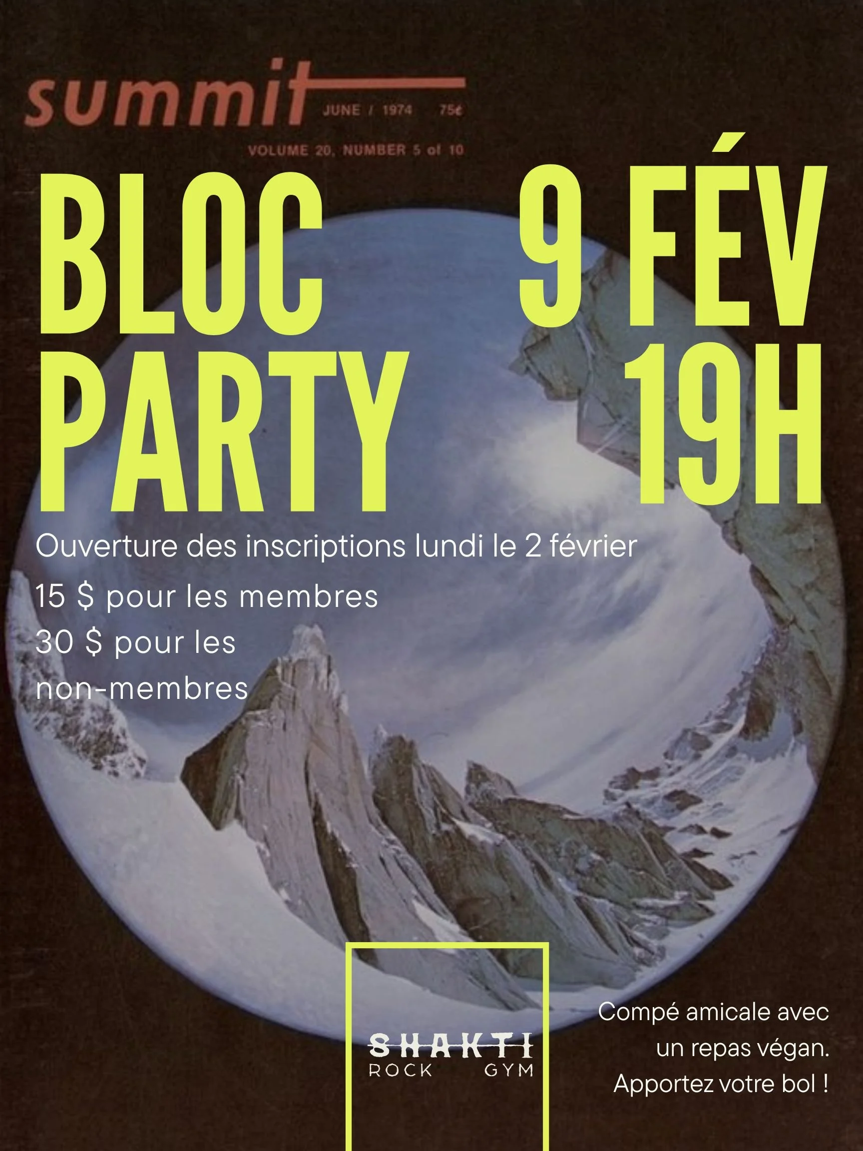 Une compétition amicale suivie d'un grand repas végétalien. Apportez vos chaussures d'escalade, une bouteille d'eau, votre propre bol et vos couverts, et soyez ouvert d'esprit ! Ce n'est pas une compétition classique. Il s'agit plutôt d'une fête, d'un moment pour grimper avec d'autres et profiter des nouveaux problèmes de bloc. Les débutants sont les bienvenus ! Inscription obligatoire.